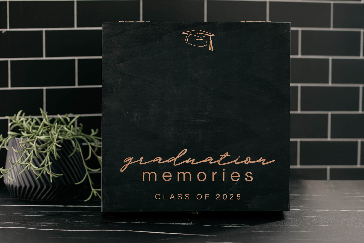 Large Wood Memory Box for seasonal occasions. Engraved as a graduation keepsake box for photos. Box is available in natural, walnut, grey and black.