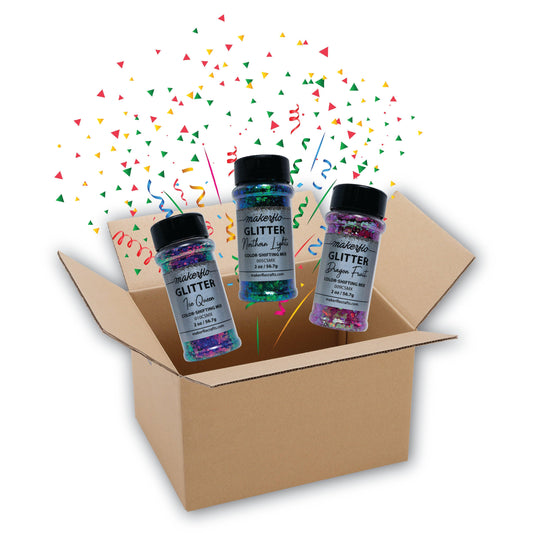 Get the most bling with MakerFlo chunky mix glitters in holographic or color shifting. Save 10% when you Build-A-Bundle of 25!