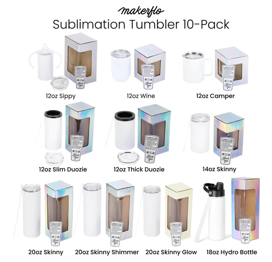 - MakerFlo sublimation tumblers come packaged in a premium holographic display box, with related tumbler accessories, perfect for a product-based business