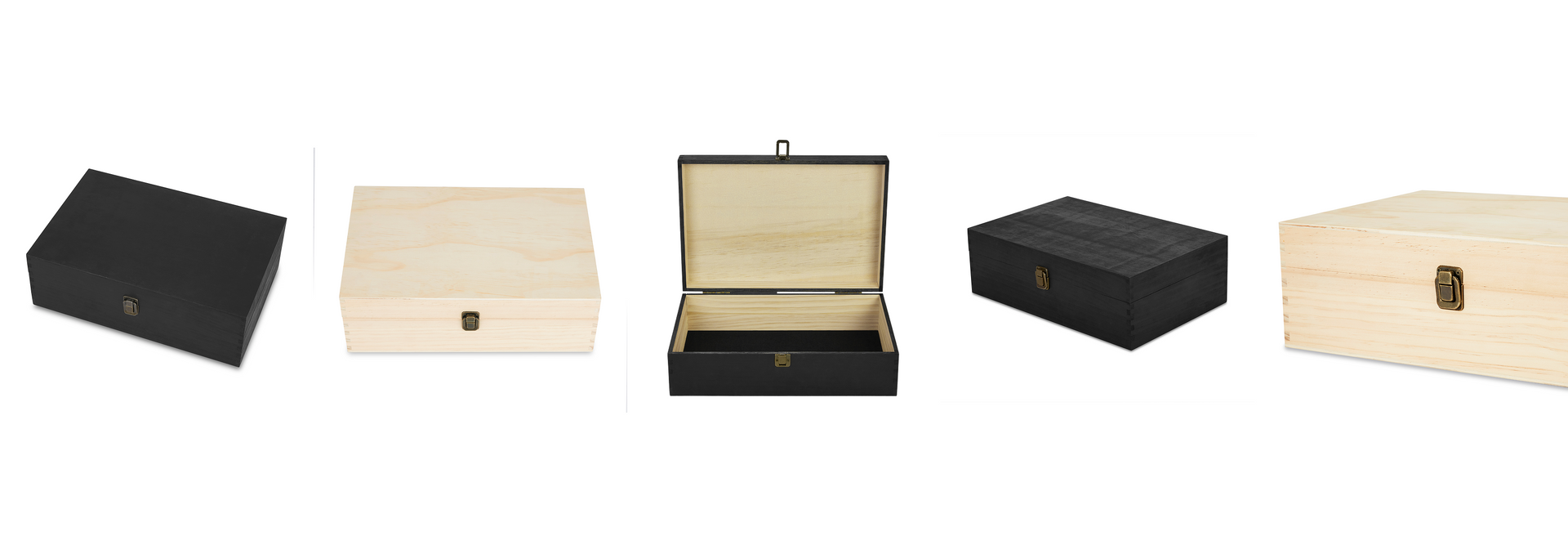 We offer various sizes and styles, including square and rectangular boxes, made from natural pine wood. We also offer Veneer Valet Boxes in medium and large size.