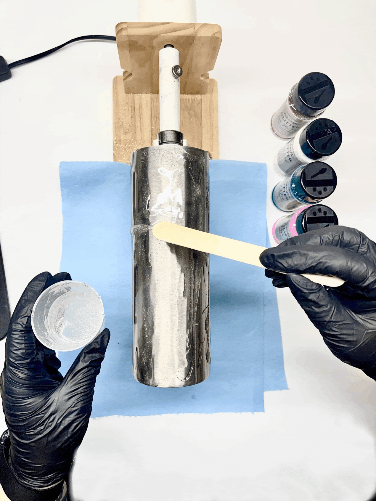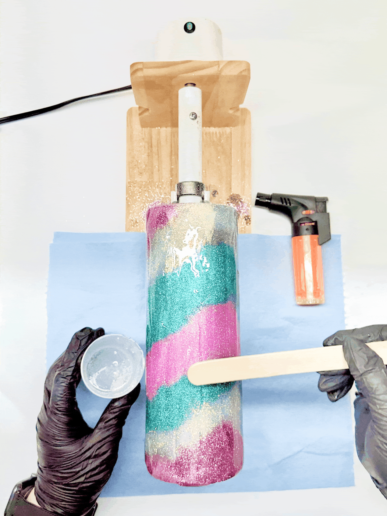 With your tumbler attached, turn your cup turner on. Begin applying the epoxy to the tumbler with a gloved hand or silicone brush, slowly spreading across the entire tumbler (don’t forget the bottom).