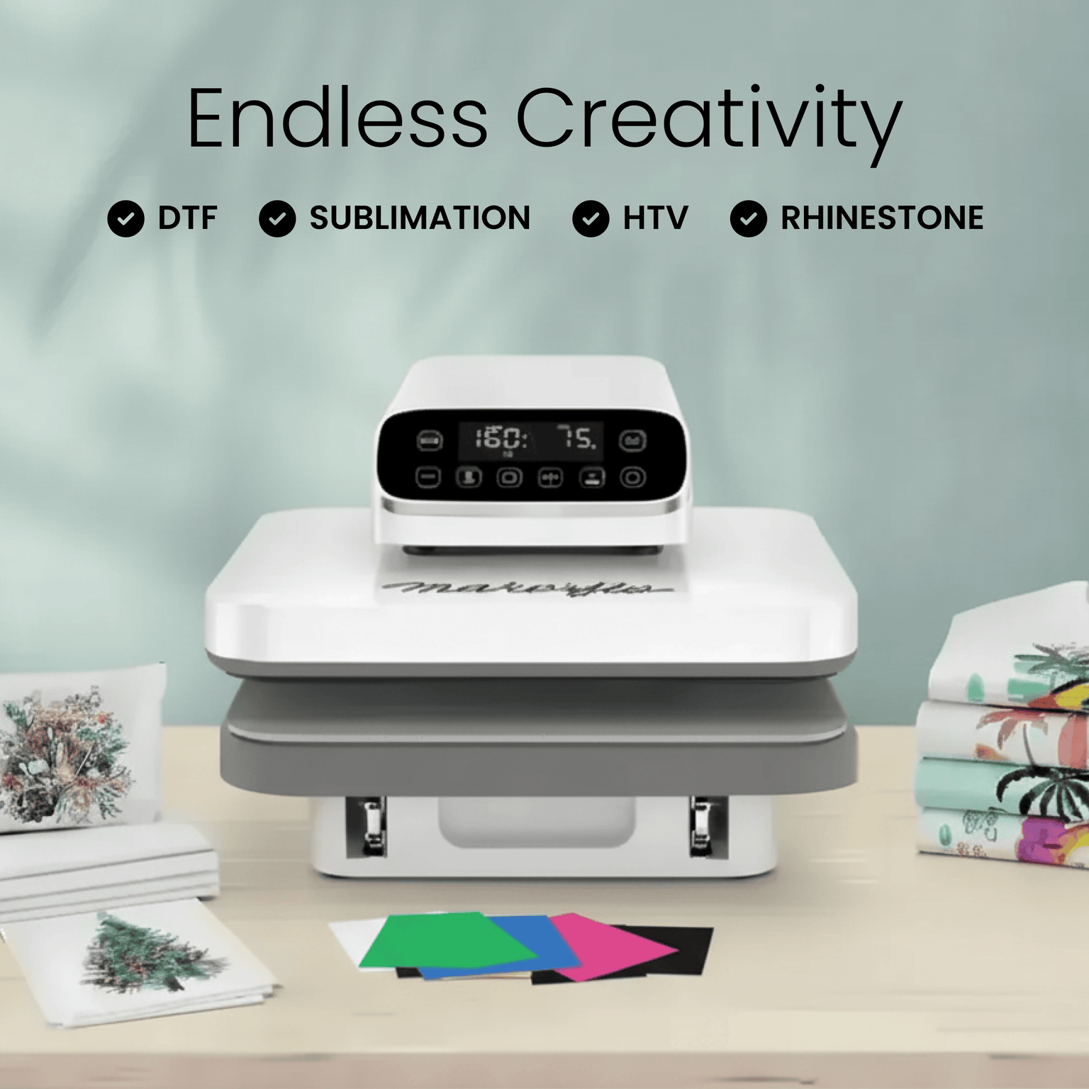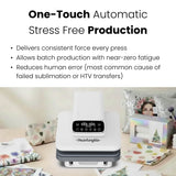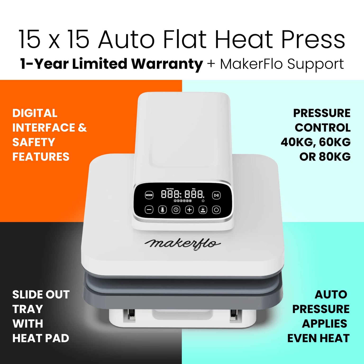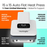 For sublimation, DTF & heat transfers -- The MakerFlo 15"x15" Automatic Flat Heat Press is engineered for efficiency, consistency, and comfort—perfect for creators who want professional-grade results without the physical strain of traditional manual presses.