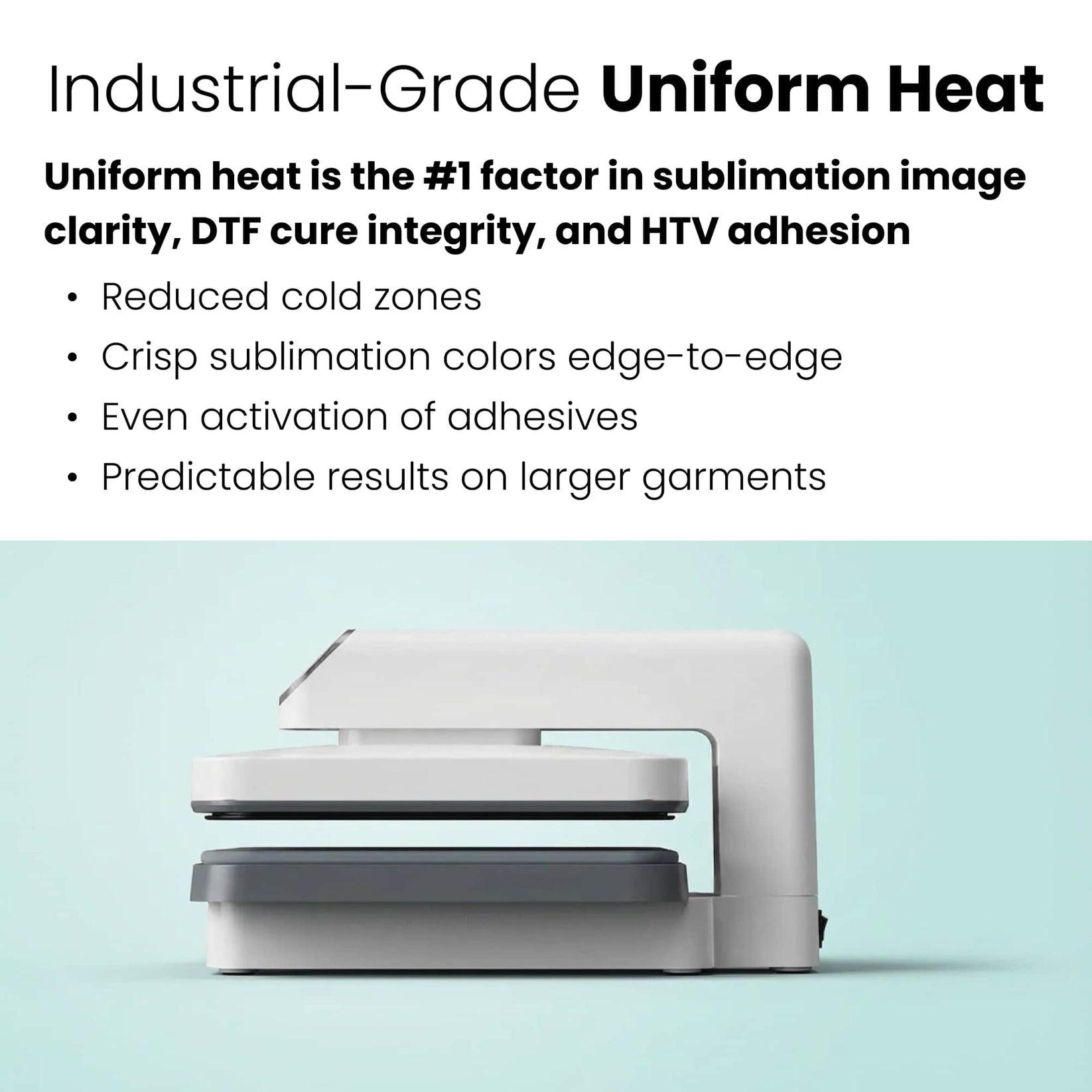 • Even Heating Plate Multiple internal coils ensure consistent heat distribution across the entire platen, reducing cold spots and improving transfer quality