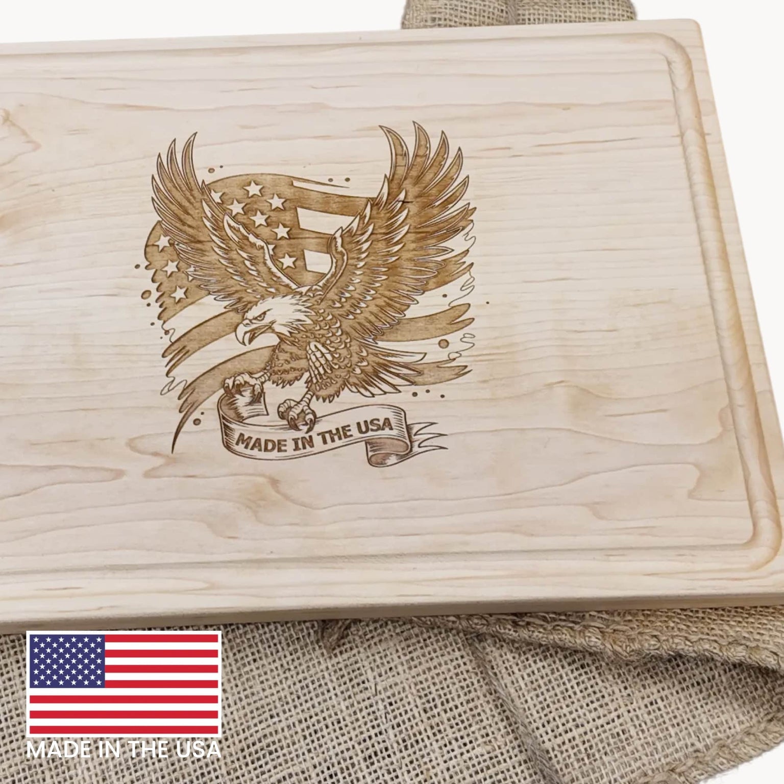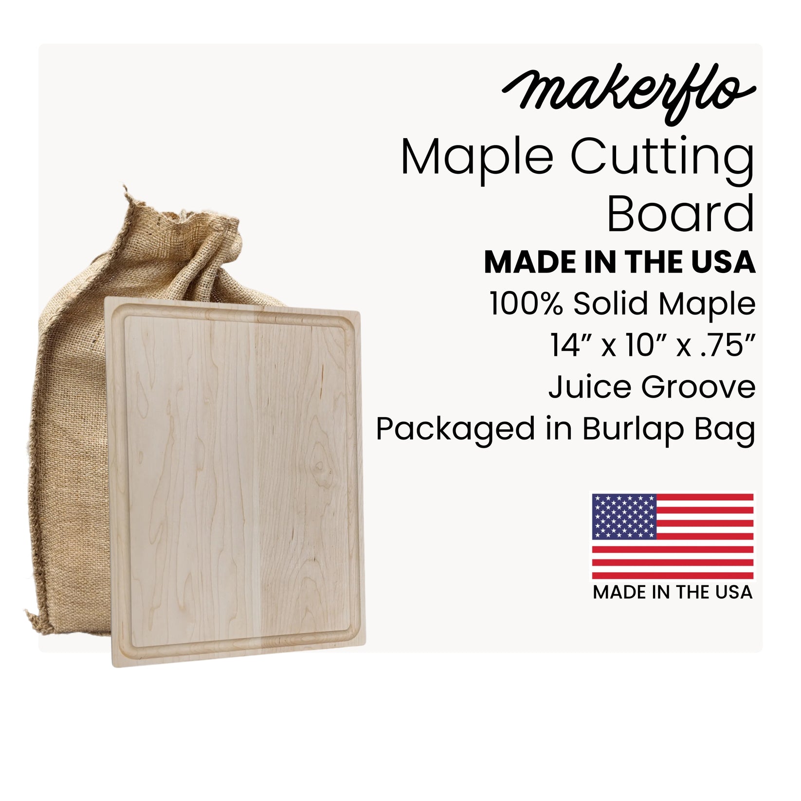 Handmade in Ohio with premium maple wood sourced from the USA, this 14" x 10" cutting board features a built-in juice groove and comes pre-conditioned with care instructions included.
