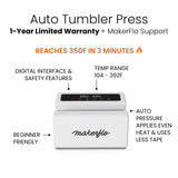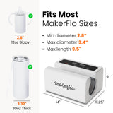 MakerFlo's new tumbler press features an automatic pressure system removing the need to tape or tightly securing your sublimation paper—just place the tumbler in the press and the machine applies even pressure every time. This makes it especially beginner-friendly for first-time tumbler makers.