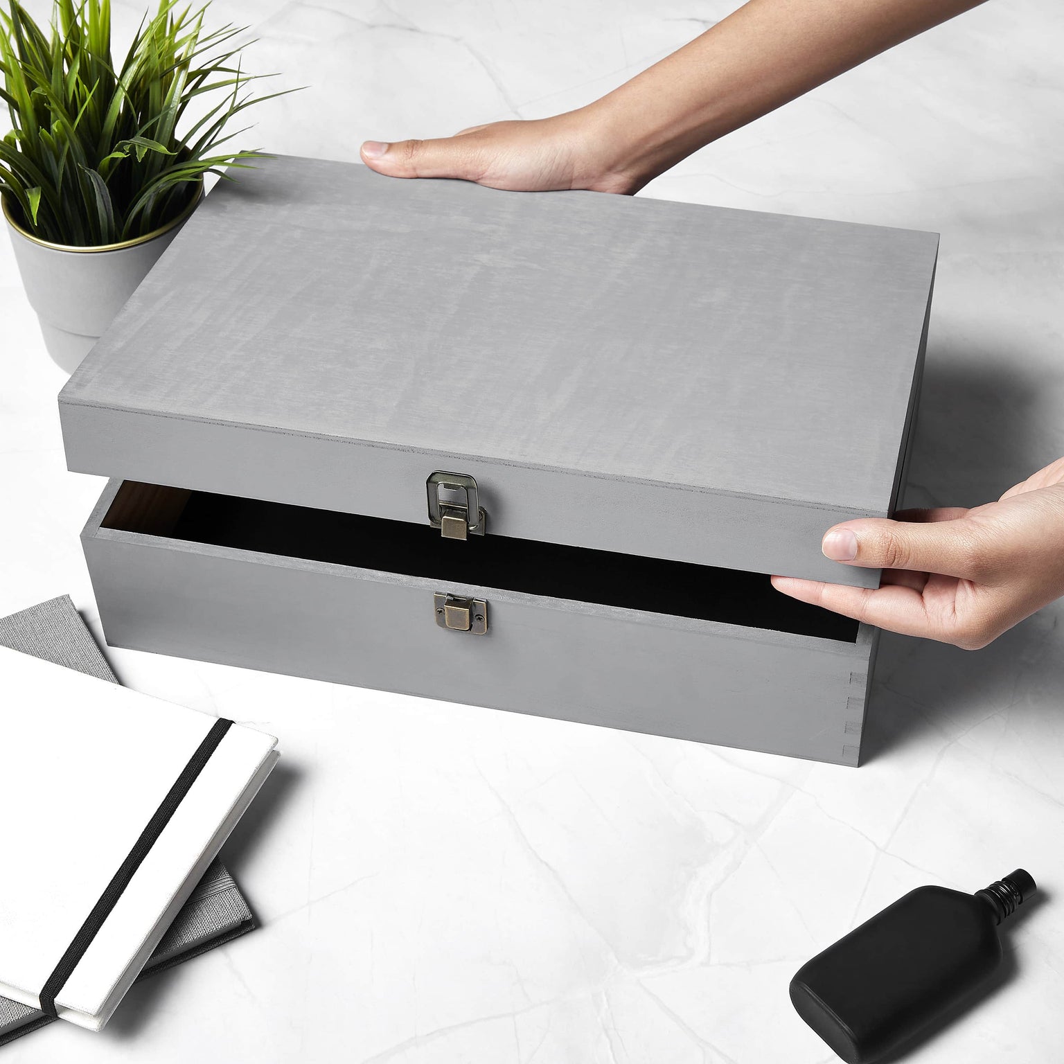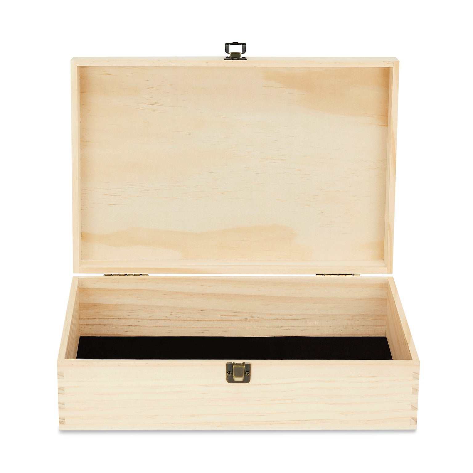 - Hinged lid with clasp on front
